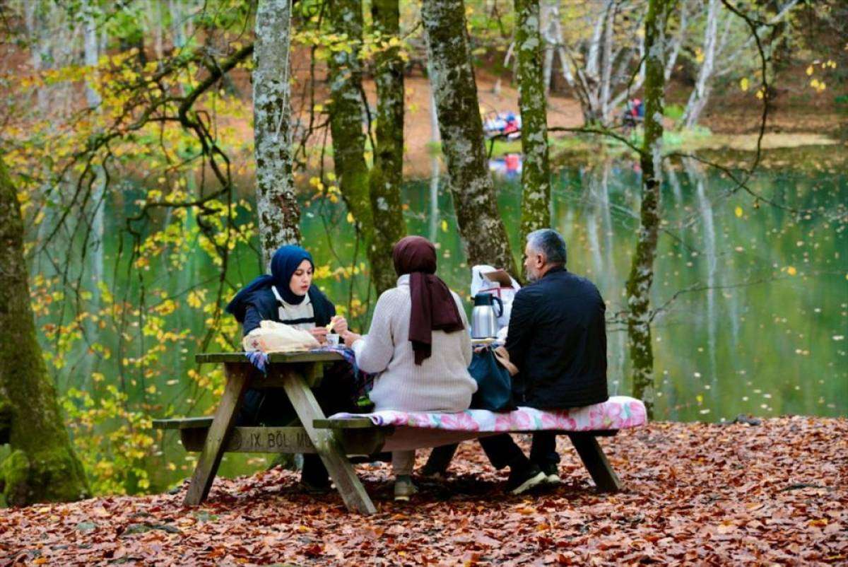 Bolu Yedigöller Milli Parkı'nı ziyaret edenler, sonbahar renkleriyle bütünleşen doğal manzarada vakit geçiriyor.