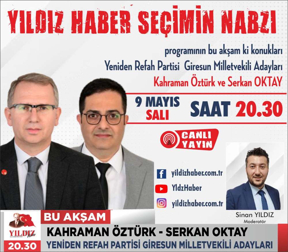 Yıldız Haber 'Seçimin Nabzı' programının bugünkü konukları; Yeniden Refah Partisi Giresun Milletvekili Adayları Kahraman Öztürk ve Serkan Oktay oldu.