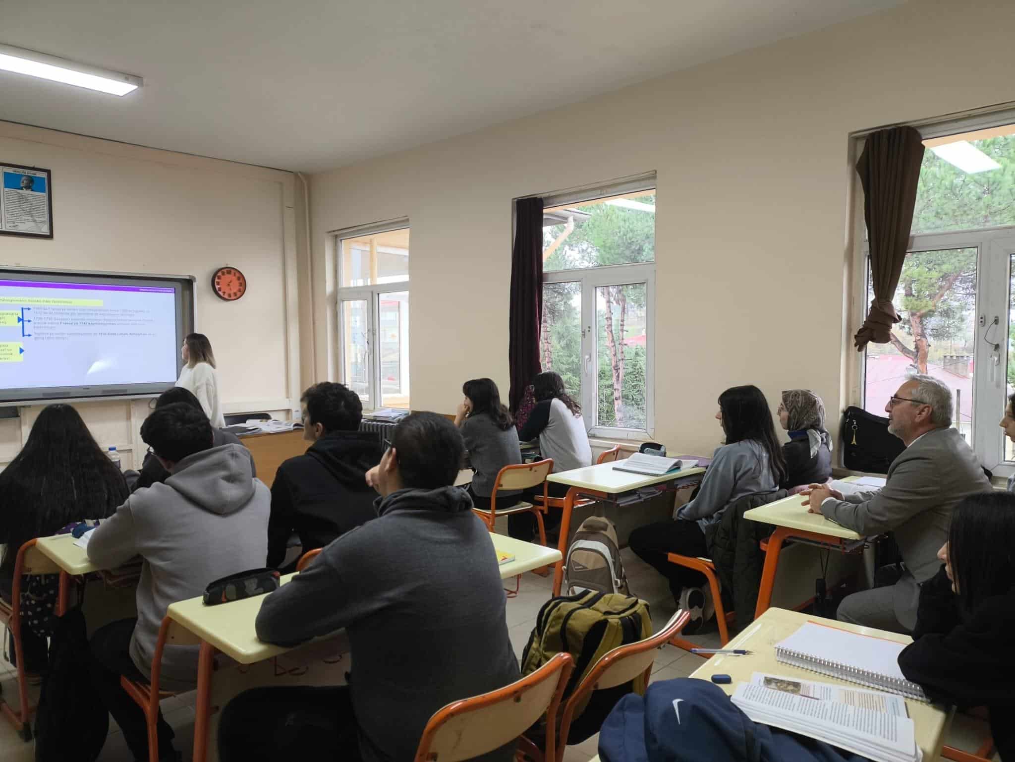 Lise öğrencileriyle gerçekleştirilen buluşmada İlçe Millî Eğitim Müdürü Yunus Aydın, Maarif Modeli hakkında öğrencilerin beklentileri doğrultusunda bilgilendirmelerde bulundu.