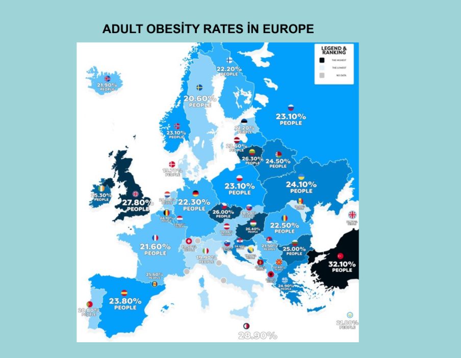 Tekrar herkese karşı yakadan gurbetten ABD’den tekrar selamlar. Bu ayki yazımı uzun zamandır benimde araştırma alanlarından olan metaboloik hastalıklara özellikle Tip-2 Diyabet Mellitus (T2DM) adıyla anıla anılan diyabet ve iştah hormonlarının dengesizliğinden dolayı kaynaklanan bir metabolik hastalık obezite hakkında biraz bahsetmek ve siz okurseverlere bir farkındalık oluşturmak niyetindeyim. Gelişmiş ülkelerin ve gelişmekte olan ülkelerin son 40 yılına bakıldığında yukarıda bahsettiğimiz metabolik hastalıklardaki artış ciddi seviyelere ulaştı maalesef. Özellikle teknolojinin gelişmesi, artık her şeyi uzaktan kumanda ile hallettiğimiz gıdaya erişimin bile artık bir tıkla halledildiği, özellikle prosese uğramış gıdaların çok tüketildiği son yıllarda üstüne de ciddi perhiz yapılamaması ve egzersiz alışkanlıklarının olmaması insanları ciddi hastalıklara maruz bıraktı. Bu konuda ülkemiz Avrupa ülkelerinde başı çektiğini üzülerek söylemem gerekiyor. Yıllar önce sanırım 2018 yılında obezite ile ilgili yaptığım bir sunumdan tek bir slayt kopyalamak istiyorum. Türkiye'nin obezite oranının o yıllarda 33.1% ile Avrupa'da bir numara olduğu simsiyah renginden belli oluyor. Bu oranın şu anda yüzde 40’ın üstüne çıktığı hatta 2030 yılında 50% civarlarında olacağı söyleniyor. Buda sokakta gördüğümüz iki kişiden birinin yüksek kilolu, obez ve diyabet hasatlığına meyilli olduğuna işarettir. Rakamların daha da artacağını öngörebiliriz.