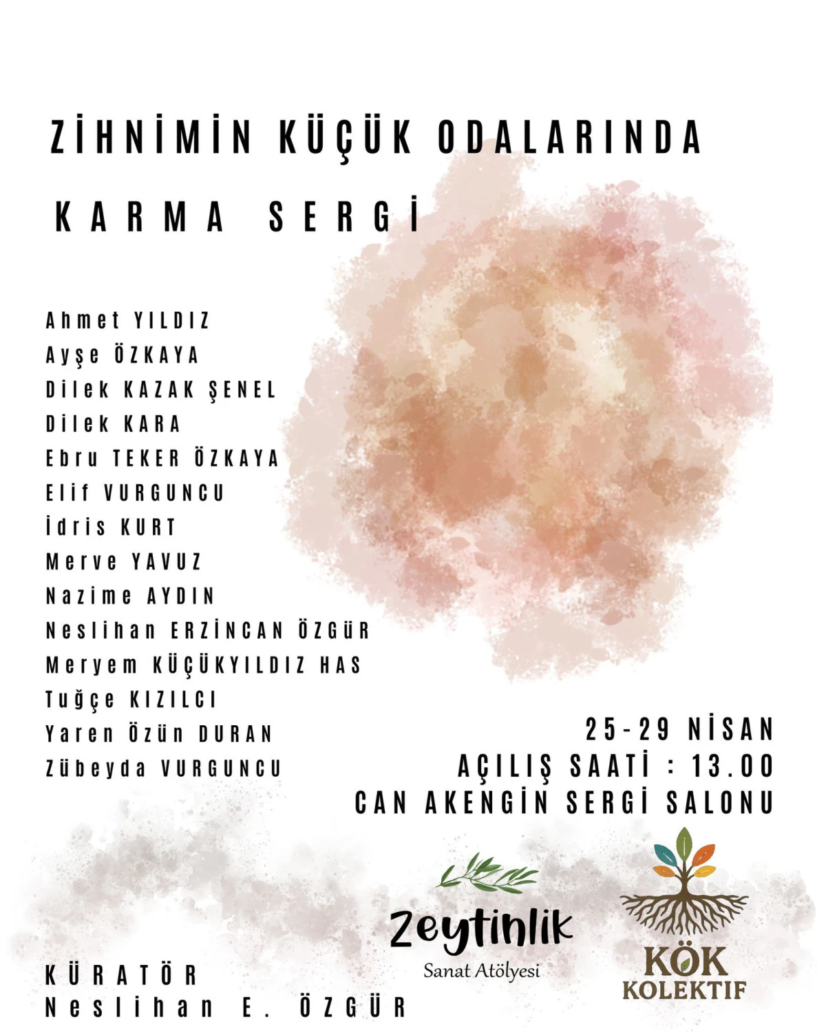 Kök Kolektif ve Zeytinlik Sanat Atölyesi iş birliğiyle düzenlenen “Zihnimin Küçük Odalarında” adlı karma sergi, 25 Nisan Cumartesi günü saat 13.00’te Can Akengin Sergi Salonu’nda sanatseverlerle buluşuyor.