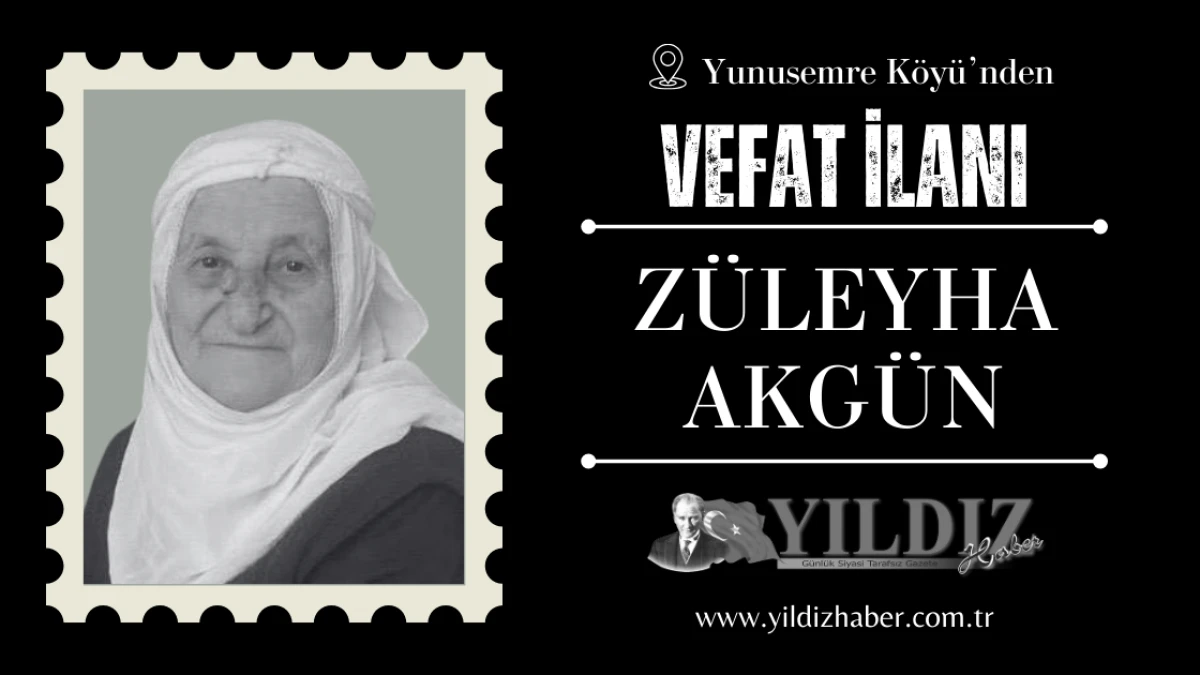 Yunusemre Köyü'nden, merhum Murat Akgün'ün eşi; Ömer, Yaşar, Döndü, Zülfiye, Mine ve Aynur'un anneleri; Pimapenci Deniz Akgün'ün anneannesi Züleyha Akgün vefat etti.