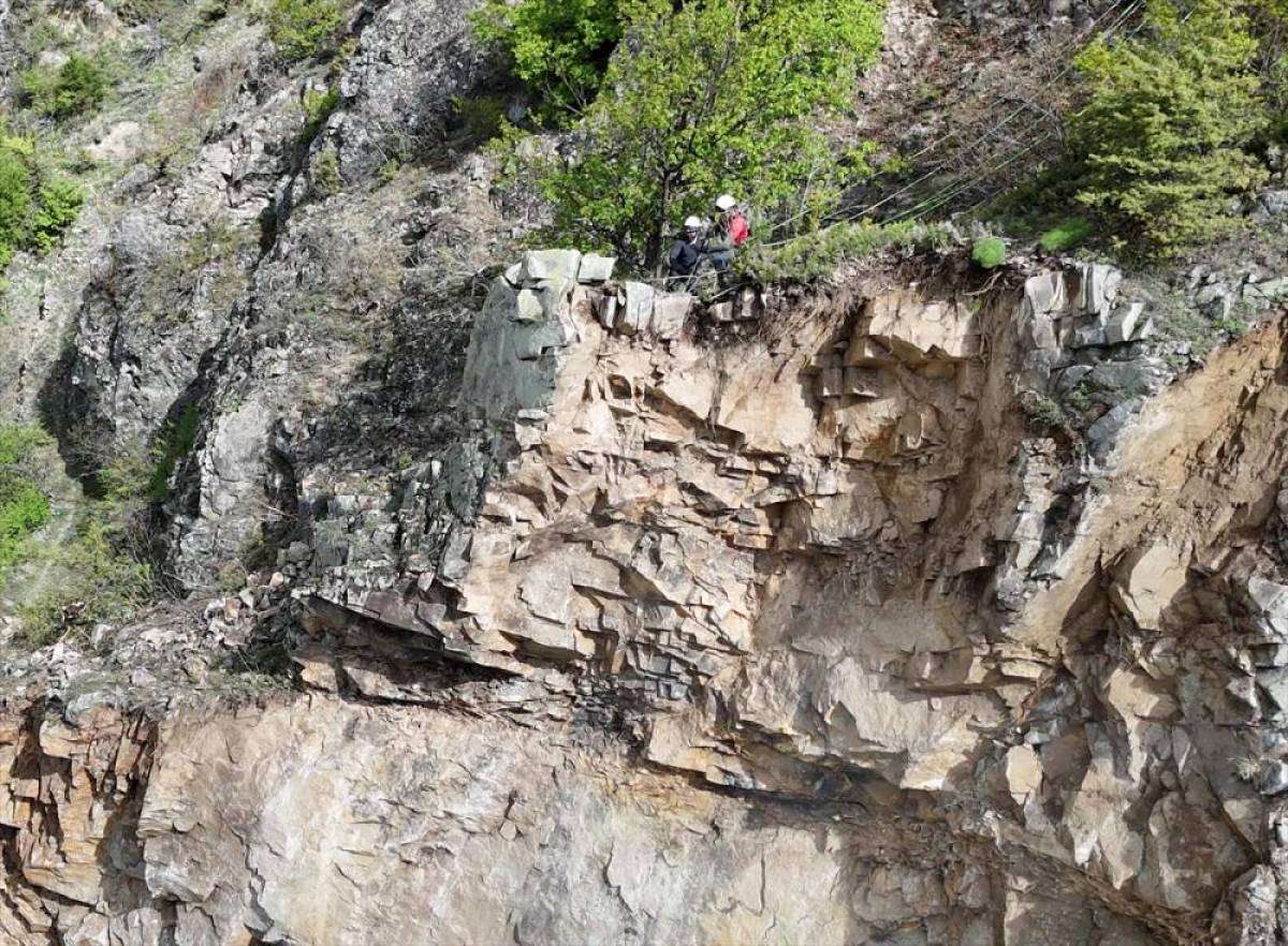 Karayolları 10. Bölge Müdürlüğünün endüstriyel dağcı ekibi, Kürtün ilçesine bağlı Karaçukur köyü mevkisinde meydana gelen heyelan sonrası 120 metrelik yamaca tırmanarak riskli kaya kütlelerini düşürüyor.