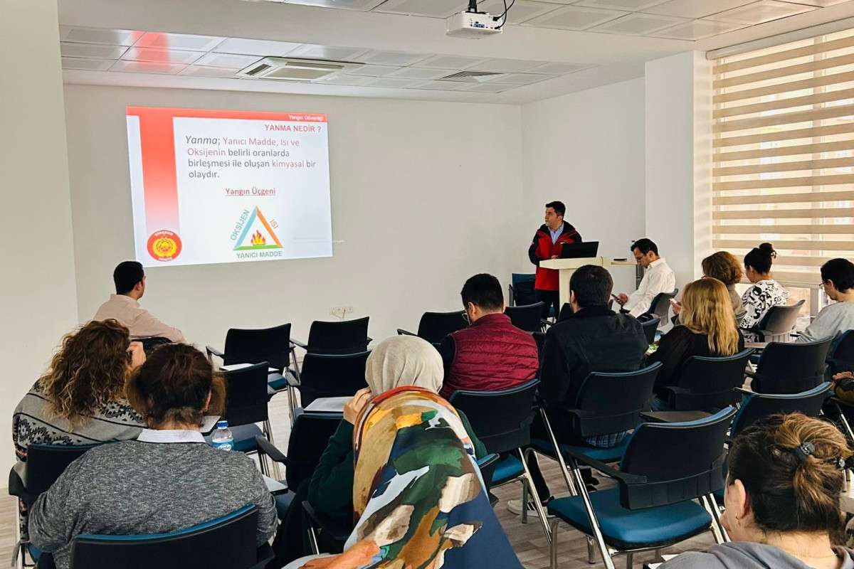 Eğitimde; yangın çıkma nedenleri, yangın çıkışlarından güvenli kaçış yolları, yangın ihbarı, yangın söndürme cihazlarının nasıl kullanılacağı, doğalgaz ve elektrik kaynaklı yangınlar, yangın anında nasıl davranılması gerektiği gibi konular ekrana yansıtılarak detaylı bir şekilde anlatıldı.
