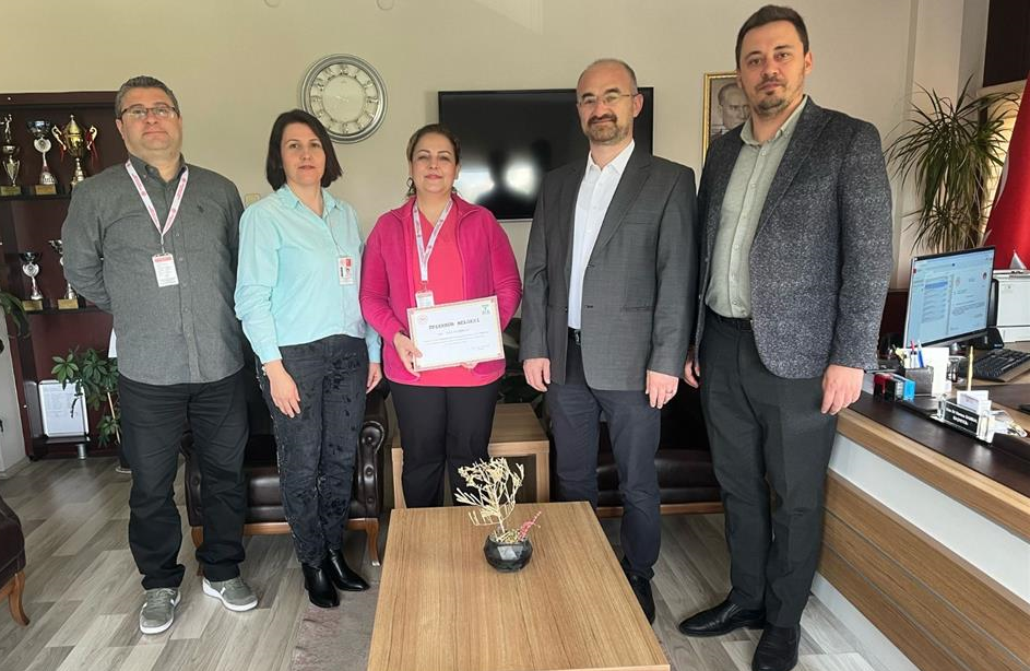 Ebe polikliniğinde görevli olan Ebe Dilek Demircan, gebelere gösterdiği özenli ve etkili hizmetlerinden ötürü hastane yönetimi tarafından takdir edilerek, Hastane Başhekimi Uz. Dr. Hamza Bambal tarafından teşekkür belgesiyle ödüllendirildi.