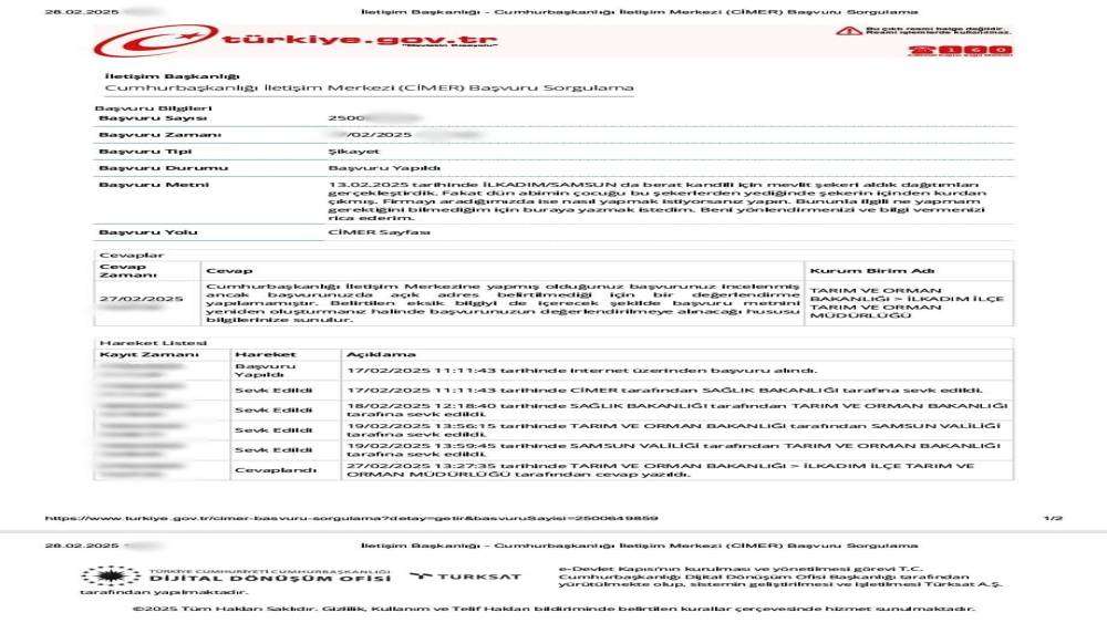 Şikayette bulunan kişi, şekerin alındığı işletmenin adresini dilekçeye ekleyerek tekrar başvuruda bulunacağını ifade etti.