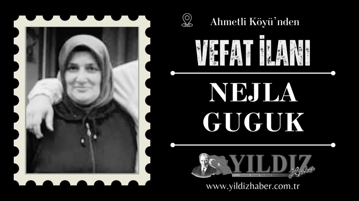 Ahmetli Köyü’nden Efendioğullarından Yusuf Guguk’un gelini, merhum Raşit Korkmaz’ın kızı ve Bulancak esnaflarından Köksal Guguk’un eşi Nejla Guguk vefat etti.