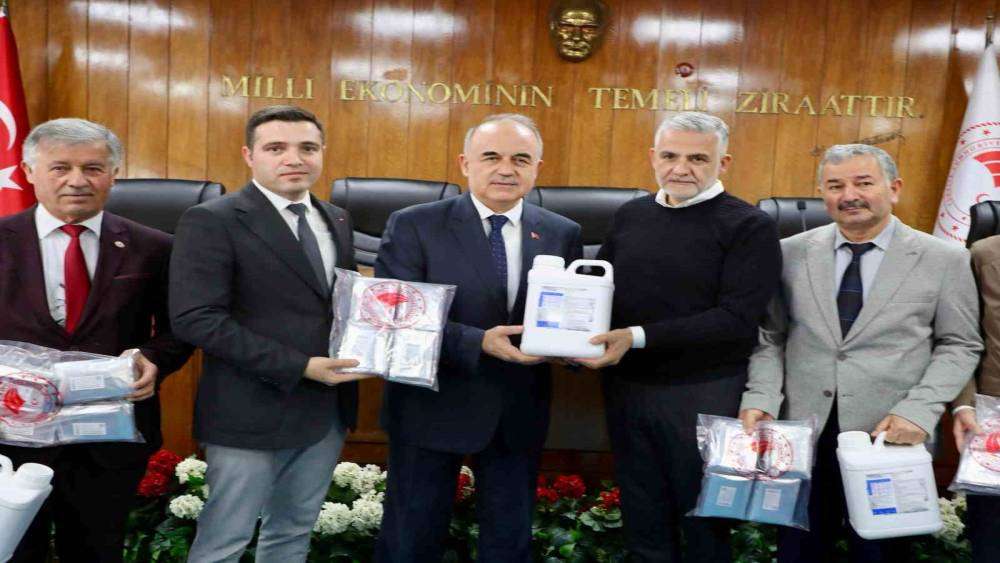 Konuşmaların ardından, Vali Muammer Erol ve diğer protokol üyeleri tarafından ilçe tarım ve orman müdürleri ile ilçe ziraat odası başkanlarına biosidal ilaç ve feromonlar teslim edildi.
