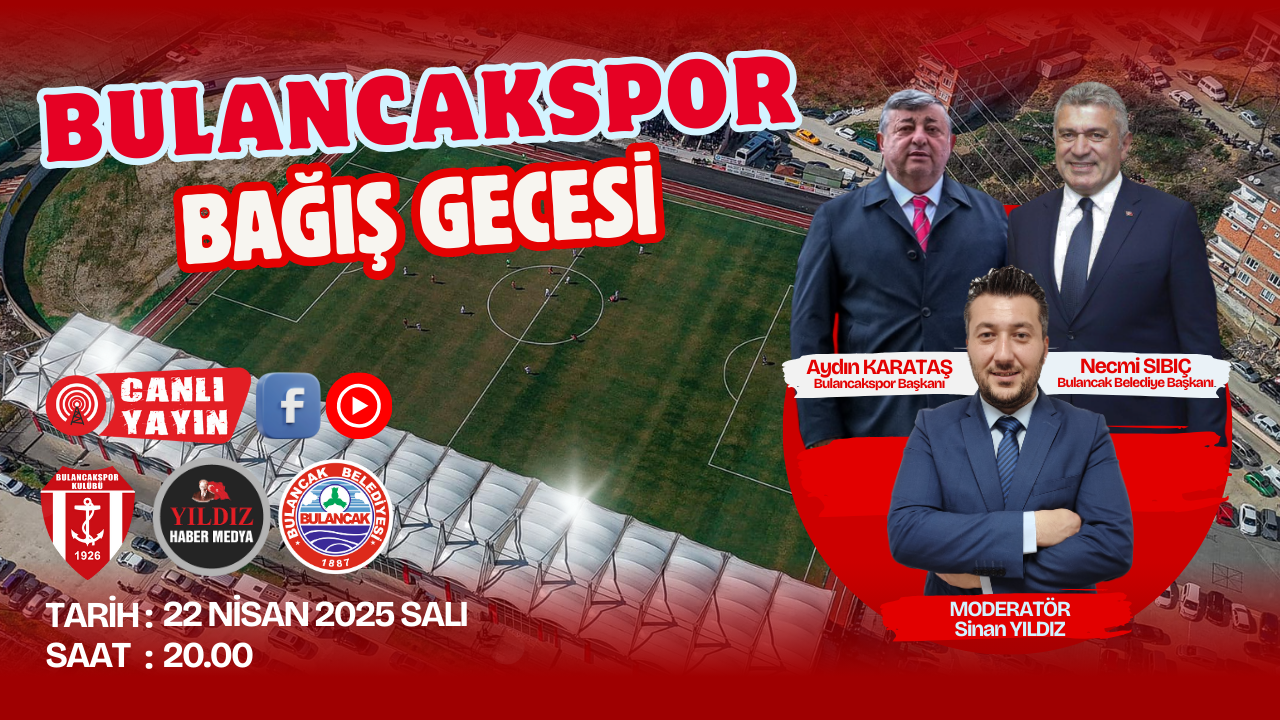 Bulancak Belediye Başkanı Necmi Sıbıç, Bulancakspor Başkanı Aydın Karataş’ın öncülüğünde Yıldız Haber Gazetesi Yazı işleri Müdürü Sinan Yıldız’ın moderatörlüğünde "Bulancakspor Bağış Gecesi" adıyla düzenlenen etkinlik, 22 Nisan 2025 Salı günü saat 20.00'de Yıldız Haber Medya, Bulancakspor ve Bulancak Belediyesi sosyal medya kanallarından ortak canlı yayınla izleyiciyle buluşacak.