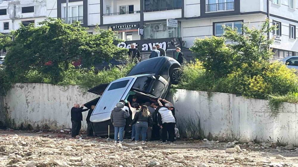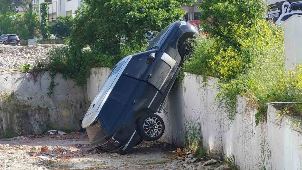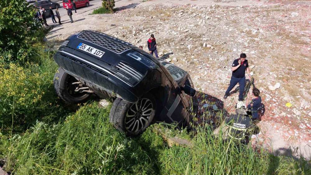 Samsun’da rampa aşağı geri geri kaçan lüks cipin istinat duvarından düşerek asılı kaldığı kazada 2 kadın yaralandı.