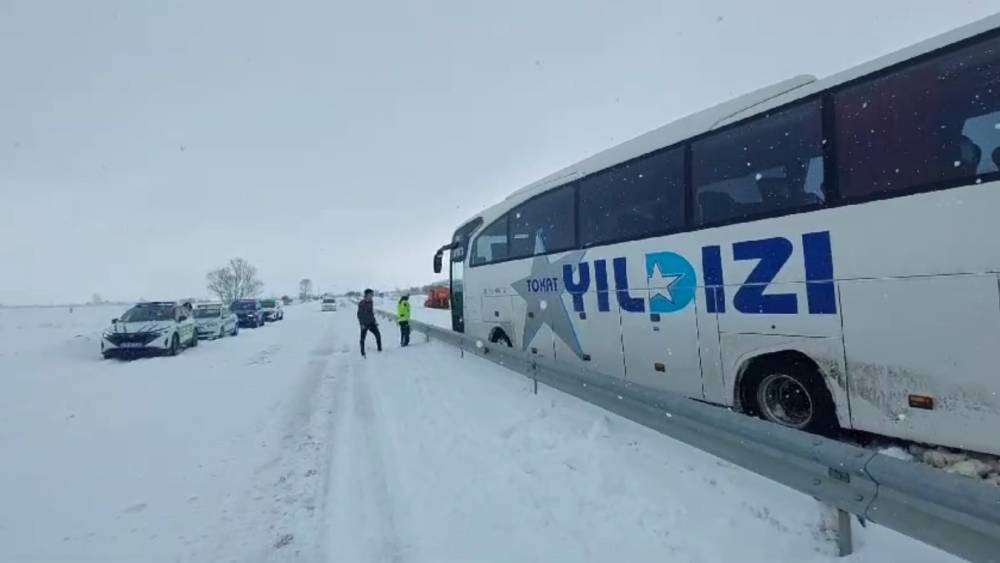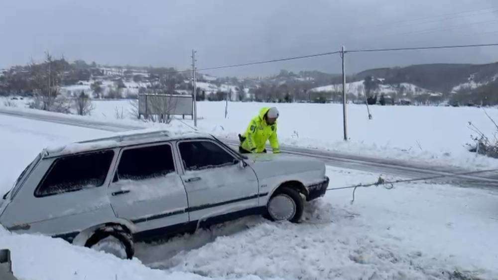 Ekipler, yoğun kar yağışı ve buzlanma nedeniyle araç sürücülerine kış lastiksiz ve zincirsiz yola çıkmamaları uyarısında bulundu.