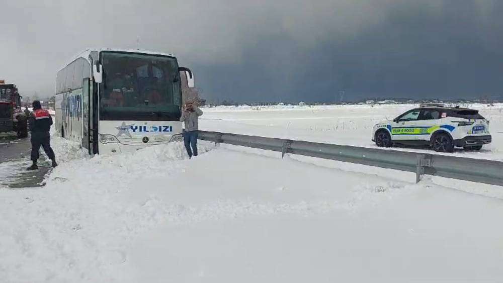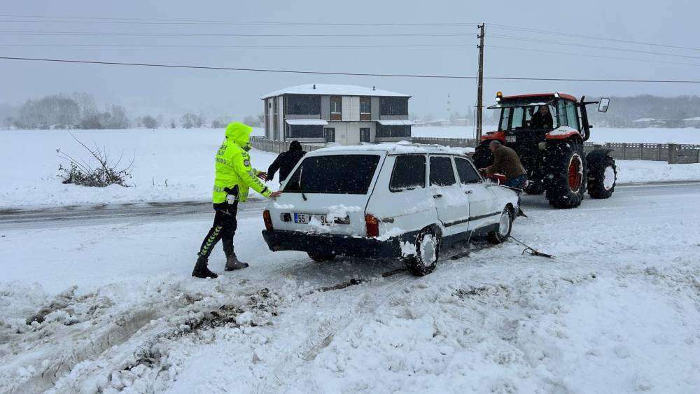 Samsun-Sinop karayolunda yoğun kar yağışı nedeniyle sürücüler zaman zaman zor anlar yaşadı. Kanala düşen yolcu otobüsü ve otomobil, trafik ekiplerinin yardımıyla kurtarıldı.Bafra-Sinop karayolunda teyakkuzda olan Bafra Bölge Trafik ekipleri, yoğun kar yağışı ve buzlanma nedeniyle yolda kayan araçları çıkartmak için seferber oldu. Sinop istikametinden Samsun’a doğru seyir halinde olan Tokat Yıldızı firmasına ait yolcu otobüsü, Alaçam Yukarıelma mevkisinde kayarak refüjdeki kanala düştü. Meydana gelen kazada şans eseri yaralanan olmadı. Olay yerine gelen bölge trafik ve Alaçam İlçe Jandarma ekipleri yol güvenliğini alarak, iş makileri yardımıyla otobüsü düştüğü kanaldan uzun uğraşlar sonucu çıkarttı. Habilli mevkisinde de bir otomobil sürücüsü buzlanma nedeniyle yoldan çıkarak kara saplandı. Habilli Mahallesi Muhtarı’ndan destek isteyen trafik ekipleri otomobili traktör yardımıyla çekerek bulunduğu yerden kurtardı.Ekipler, yoğun kar yağışı ve buzlanma nedeniyle araç sürücülerine kış lastiksiz ve zincirsiz yola çıkmamaları uyarısında bulundu.