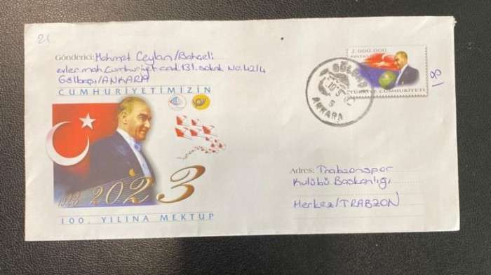 Ceylan, mektubunu, Cumhuriyet'in 100'üncü yılında Trabzonspor Kulübüne verilmesi için PTT'ye teslim etti.