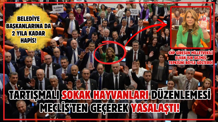 TBMM Genel Kurulu'nda kabul edilerek yasalaştı. Kanun, Resmi Gazete'de yayımlandıktan sonra yürürlüğe girecek. Meclis, oylamanın ardından 1 Ekim'e kadar tatile girdi. Oylama Sonuçları Teklifin kabul edilmesinde 594 milletvekilinden 500'ü oy kullandı. 275 milletvekili kabul oyu verirken, 224 milletvekili ret oyu verdi. Bir milletvekili ise çekimser kaldı. Böylece teklif, Ak Parti ve MHP oylarıyla yasalaştı. Muhalefetin Tepkisi CHP Genel Başkanı Özgür Özel, kanunun Anayasa'ya aykırı olduğunu belirterek, yürütmeyi durdurma talebiyle Anayasa Mahkemesi'ne başvuracaklarını açıkladı. Özel, kanunun yaşam hakkını savunmadığını vurguladı. Görüşmelerin Detayları CHP Ankara Milletvekili Aliye Timisi Ersever, kürsüye "Öldürme beni" yazılı hayvan fotoğraflarıyla çıktı. CHP Grup Başkanvekili Murat Emir, sabahlara kadar çalışıp hayvanları katledecek bir yasa çıkarılmasını eleştirerek, Ak Parti grubuna seslendi. İYİ Parti Grup Başkanvekili Turhan Çömez, kısırlaştırma ve önlemlerle sorunun çözülebileceğini belirtti. Saadet Partisi Grup Başkanvekili İsa Mesih Şahin, merkezi yönetimin bu konuda elini taşın altına koyması gerektiğini vurguladı. Tartışmalı 5. Madde Teklifin 5. maddesi, sokak köpeklerinin öldürülmesinin yolunu açıyor. Madde, Ak Parti'nin önergesiyle değiştirilerek kabul edildi. Yeni düzenlemeye göre, bakımevine alınan ve tehlike teşkil eden köpekler, Veteriner Hizmetleri Kanunu'na göre öldürülebilecek. Yeni Düzenlemeler Kedi ve köpek sahipleri, hayvanlarını 31 Aralık 2025'e kadar dijital kimliklendirme yöntemleriyle kayıt altına aldırmak zorunda. Belediyeler, 31 Aralık 2028'e kadar barınaklar kurmak ve rehabilitasyon işlemlerini gerçekleştirmekle yükümlü olacak. Belediyeler, sahipsiz hayvanlara sahiplendirilinceye kadar bakmak için bütçelerinin belirli bir oranını kaynak olarak ayıracak. Protestolar ve Tepkiler TBMM Tarım, Orman ve Köyişleri Komisyonu Başkanı Vahit Kirişçi, 2004-2023 yılları arasında kısırlaştırılan, aşılanan ve sahiplendirilen hayvan sayıları hakkında bilgi verdi. 322 barınağın olduğunu belirten Kirişçi, barınak yapım sürecinin tamamlanması için 2028'in belirlendiğini açıkladı. CHP ve DEM Parti milletvekilleri, kanun teklifini protesto etmek için kırmızı boyalı beyaz eldivenler takarak Genel Kurul'da yer aldı. Aynı saatlerde, Ankara Anıtpark’ta sivil toplum örgütleri, meslek örgütleri ve hayvanseverler yasa teklifine karşı eylem düzenledi. Belediye Başkanlarına 2 Yıla Kadar Hapis Belirtilen kaynağı ayırmayan belediye başkanı ve meclis üyeleri ile ayrılan kaynağı hayvan bakımevi kurmak, sahipsiz hayvanları toplamak, rehabilite etmek veya sahiplendirilinceye kadar bakmak için harcamayan veya bu kaynağı başka amaçlar için sarf eden belediye başkanı ve belediye yetkililerine 6 aydan 2 yıla kadar hapis cezası verilecek. Söz konusu belediyeler 31 Aralık 2028’e kadar belirtilen hayvan bakımevlerini kurmakla ve mevcut bakımevlerinin koşullarını iyileştirmekle yükümlü olacak. Belediyeler, 31 Aralık 2028’e kadar hayvan bakımevleri kurmak, rehabilitasyon işlemlerini gerçekleştirmek ve sahipsiz hayvanlara sahiplendirilinceye kadar bakmak için kesinleşmiş en son bütçe gelirlerinin binde 5’i oranında kaynak ayıracak. Bu oran, büyükşehir belediyelerinde binde 3 olarak uygulanacak. Ayrılan ödenekler başka bir amaç için kullanılamayacak. Kedi ve köpek sahipleri, hayvanlarını en geç 31 Aralık 2025’e kadar dijital kimliklendirme yöntemleriyle kayıt altına aldırmak zorunda olacak. Teklifle, sokakta bakıma ve korunmaya ihtiyacı olacak sahipsiz hayvan bulunmaması amaçlandığı için Hayvanları Koruma Kanunu’ndaki “yerel hayvan koruma görevlileri”ne ilişkin hüküm yürürlükten kaldırılacak. Muhalefet milletvekilleri teklifin kabul edilmesine tepki gösterdi.