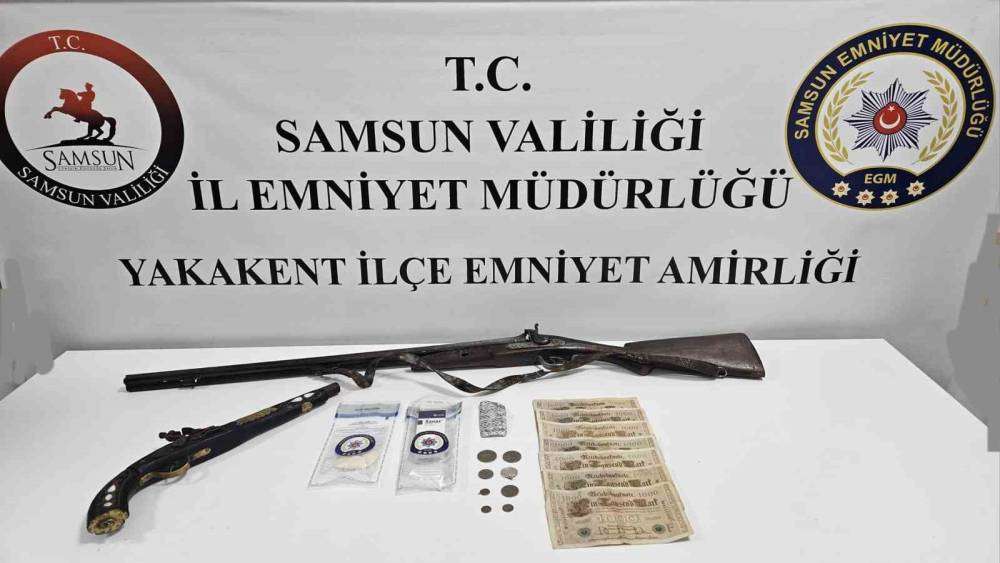 Edinilen bilgiye göre, Samsun Emniyet Müdürlüğü Narkotik Suçlarla Mücadele Şube Müdürlüğü ve Yakakent İlçe Emniyet Müdürlüğü ekiplerince Yakakent ilçesinde düzenlenen denetimlerde, M.E. (21) ve B.Ş.’nin (42) üzerlerinde ve araçlarında arama yapıldı. Yapılan aramalarda, 1 adet tarihi eser niteliğinde doldurma tüfek, 1 adet tarihi eser niteliğinde doldurma tabanca, 7 adet tarihi eser niteliğinde kağıt para, 8 adet tarihi eser niteliğinde metal para, 36 adet sentetik ecza hap ve 16,6 gram taş kokain ele geçirildi. Olayla ilgili gözaltına alınan ve ’metafizik uzmanı’ olarak tanınan B.Ş. ve şoförü emniyetteki işlemlerinin ardından Alaçam Adliyesine sevk edildi.