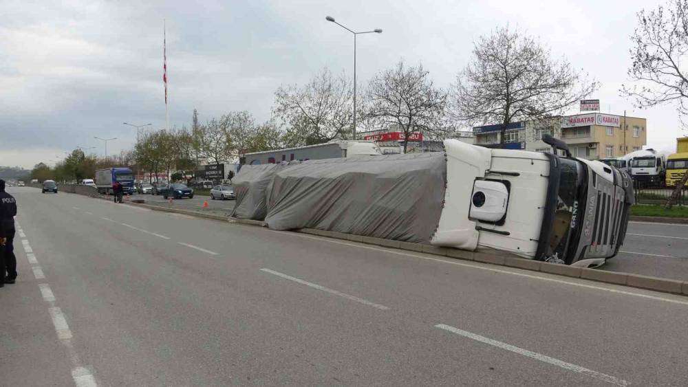 Samsun’da temizlik malzemesi yüklü tırın devrilmesi sonucu 1 kişi yaralandı.Kaza, Tekkeköy ilçesi Atatürk Bulvarı üzeri Kirazlık mevkisinde meydana geldi. Edinilen bilgiye göre, Fatih Karaman (47) idaresindeki 06 DZH 690 dorse plakalı tır, seyir halindeyken henüz bilinmeyen bir nedenle kontrolden çıkarak önce yol kenarındaki bariyerlere çarptı, ardından devrildi. İhbar üzerine olay yerine sağlık, polis ve itfaiye ekipleri sevk edildi.Kazada yaralanan sürücü Fatih Karaman, sağlık ekiplerinin olay yerindeki ilk müdahalesinin ardından Gazi Devlet Hastanesi’ne kaldırılarak tedavi altına alındı.Tırın devrilmesi nedeniyle Atatürk Bulvarı üzerinde trafik akışı bir süre aksadı. Devrilen tırın taşıdığı temizlik malzemeleri yola saçılırken, trafik ekipleri bölgede güvenlik önlemi aldı.Kazayla ilgili inceleme başlatıldı.