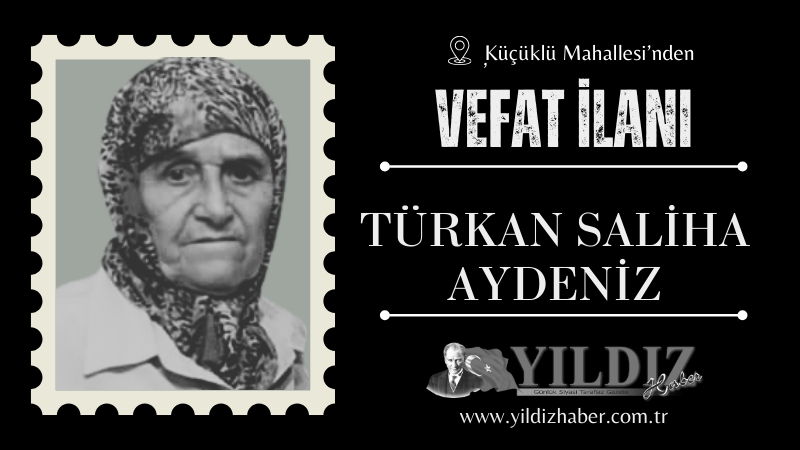 Hasan-Hülya Aydeniz, Ayşegül Yılmaz’ın biricik anneleri, merhum Salih, merhum Mustafa Aydeniz, Bahtiyar Aydeniz, Güngör Taşkın, merhume Fatma Çağla ve Şükran Bayar’ın kız kardeşleri Türkan Saliha Aydeniz’in cenazesi 9 Ekim Çarşamba günü(yarın) öğle namazına müteakip Orta Cami'de kılınacak cenaze namazından sonra Küçüklü Köyü Yukarı Aile Mezarlığında toprağa verilecek.