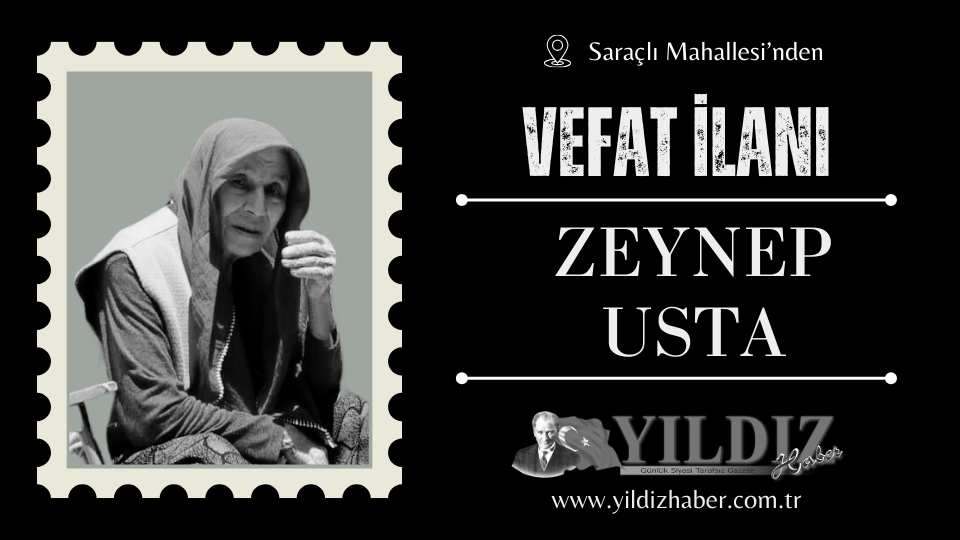 Saraçlı Mahallesi'nden, Ahmetustaoğulları'ndan, Merhum Abdurahman ve Habibe Özdemir'in kızı, merhum Hacı Mehmet Usta'nın eşi, Gülyan, Nejat, Salih, Yaşar ve Erol'un anneleri, Zeynep Usta vefat etti.